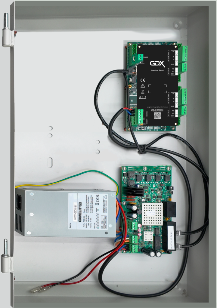 The GDX Next Entrance Panel Expansion Unit using a third‑party access solution has been designed to allow the GDX Next system to be expanded in increments of two entrance panels, with everything required included in a robust enclosure that is pre-wired to save valuable installation time on site.