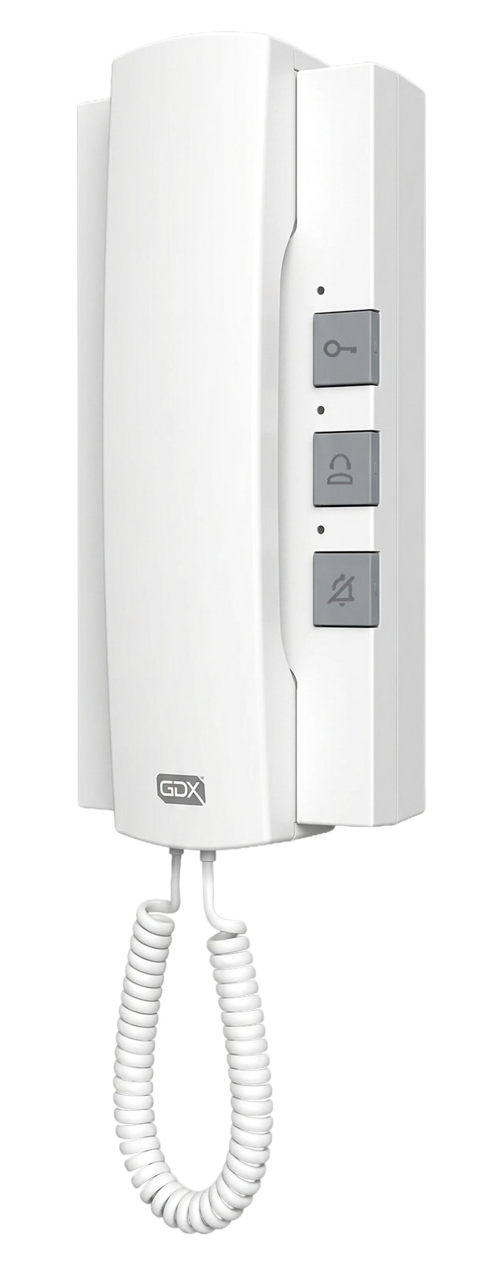 The Audio Handset provides full duplex communication and is designed to work seamlessly with the GDX Next system. It features three buttons with raised symbols that allow the resident to grant visitor access, activate privacy mode, and use a Concierge function reserved for future system enhancements.